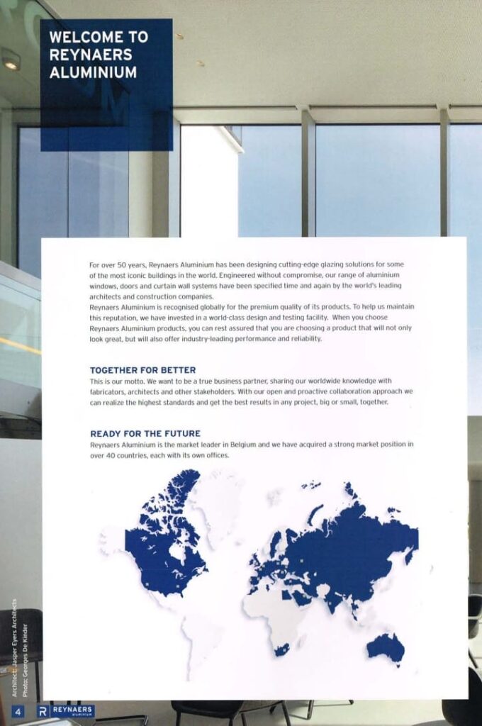 Reynaers Aluminium is a European company specializing in the design and manufacturing of sustainable aluminum solutions for the building sector. Established in Belgium, it is well-known for its high-quality aluminum systems used in windows, doors, curtain walls, sliding systems, sun-screening, and conservatories. Reynaers provides innovative solutions that focus on energy efficiency and design flexibility, catering to both residential and commercial architecture. If you have specific questions or need more information about Reynaers’ products or services, feel free to ask!